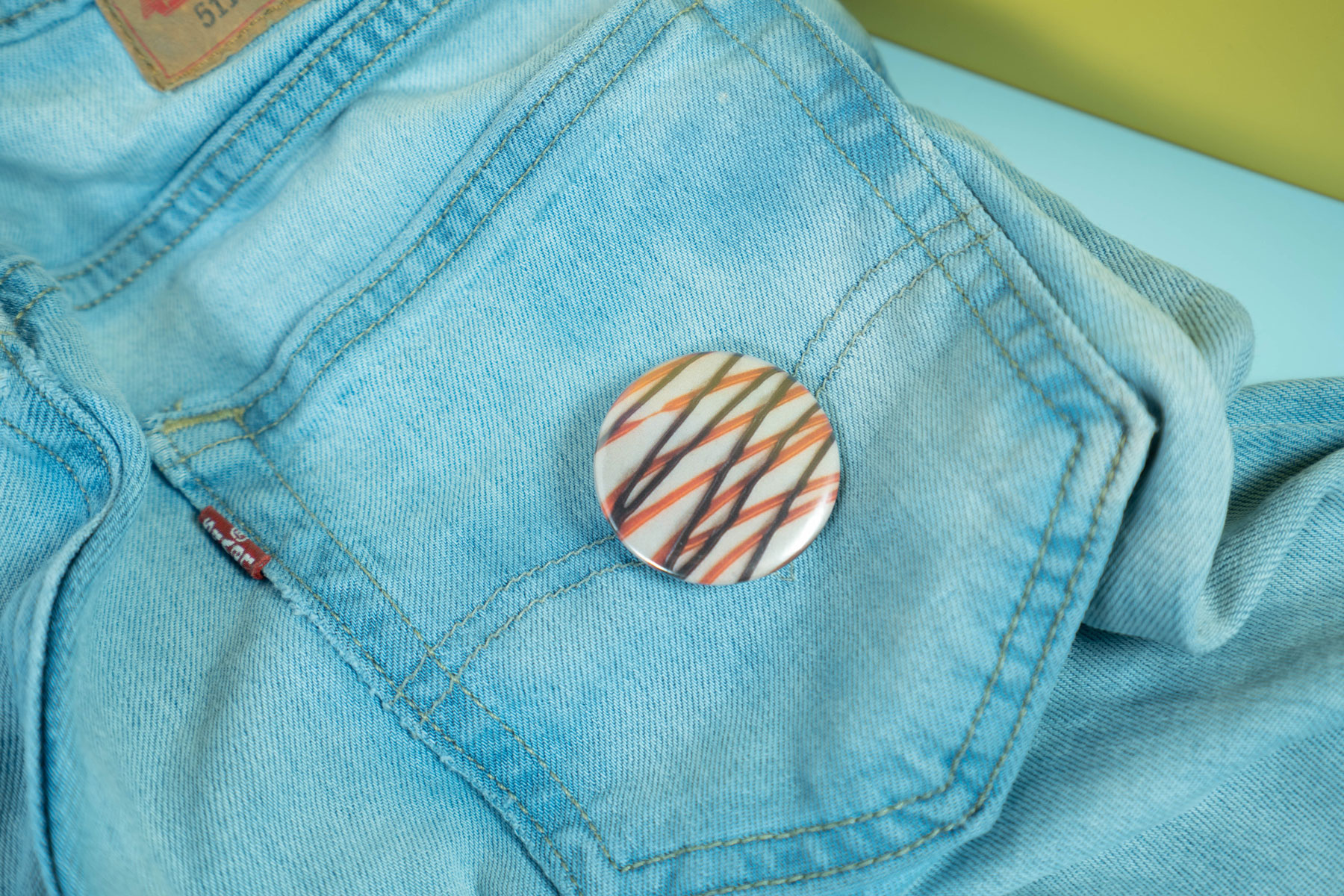 Handmade, upcycled, one-of-a-kind button with plastic back.